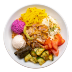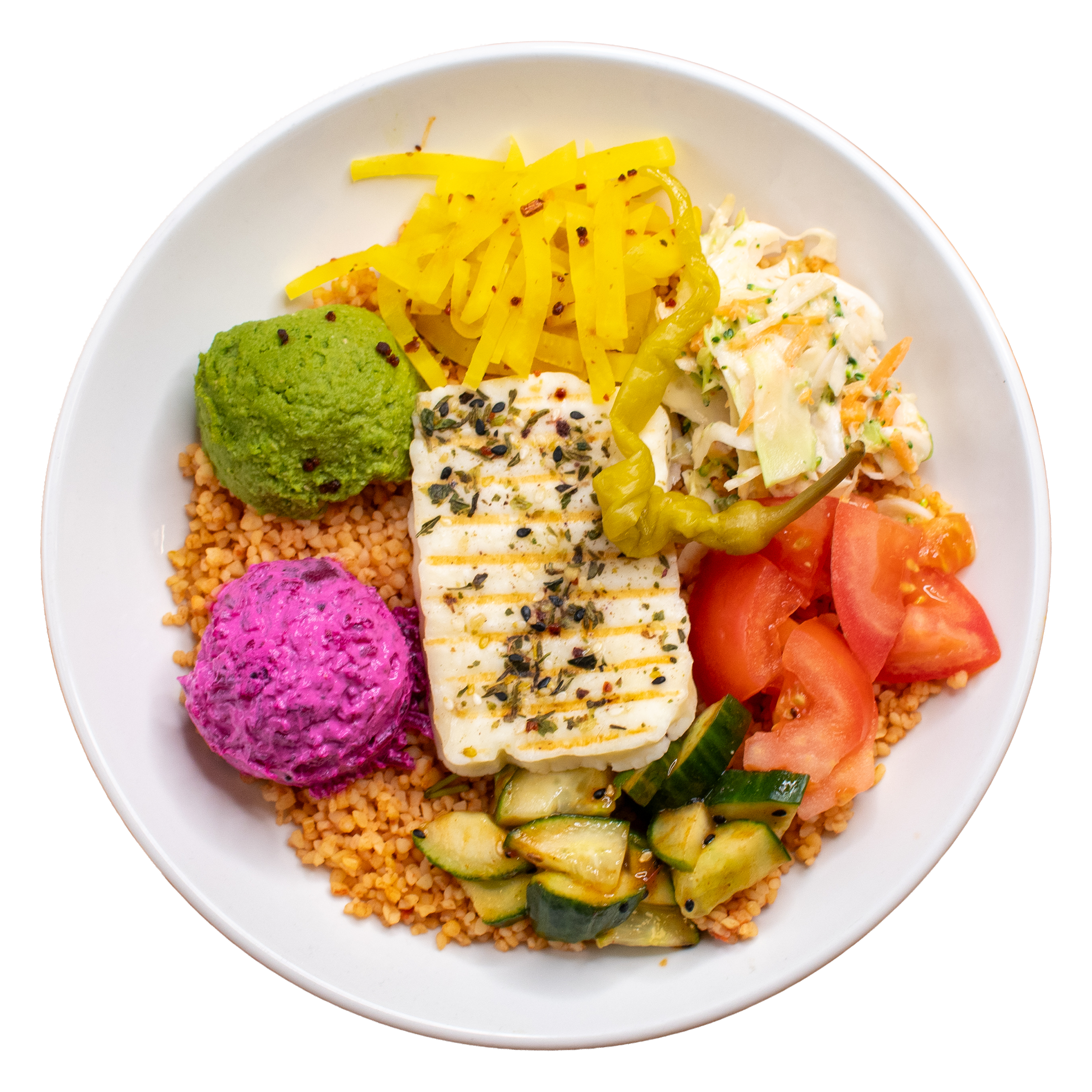 halloumi, ürdihummus, peedi labneh, tomat, marineeritud värske kurk, coleslaw salat, marineeritud daikon, zaatar maitseaine, bulgur