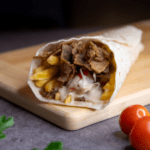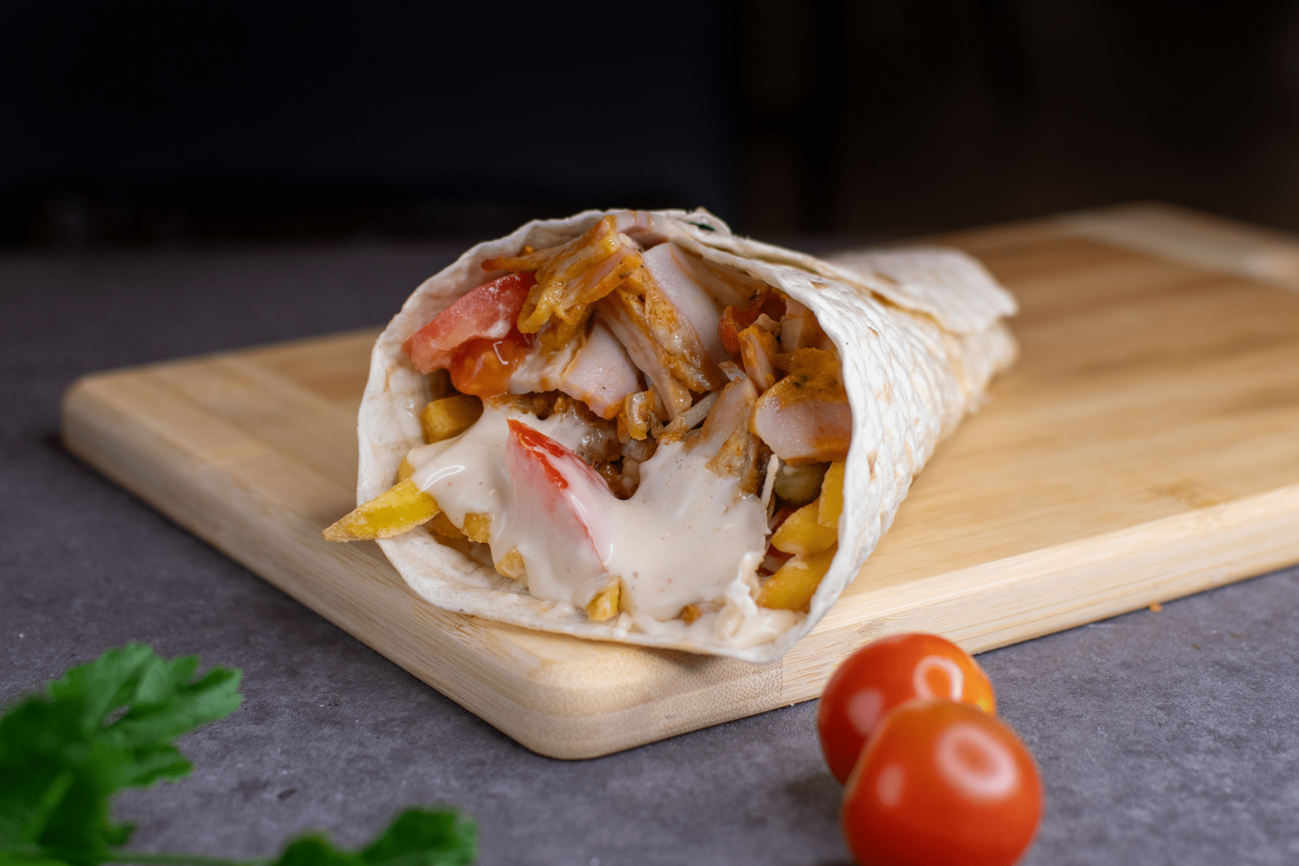 sidrunikana kebab, harissa labneh, sriracha majo, tomat, vürtsikurk, coleslaw salat, tortilla, friikartulid, marineeritud daikon